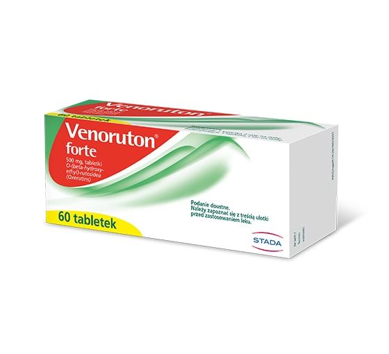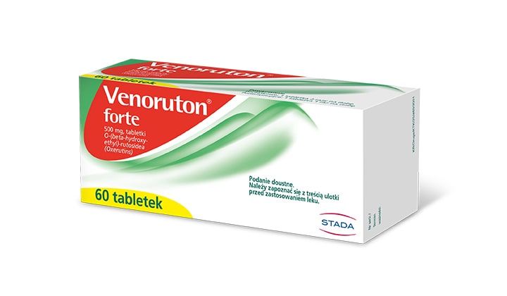 Venoruton® forte to lek dostępny bez recepty w postaci tabletek, zawierajacy w swoim składzie okserutynę w dawce 500 mg. Zawarte w Venorutonie forte O- (beta-hydroksyetylo) -rutozydy, należą do grupy leków chroniących naczynia (zwanych ogólnoustrojowymi wazoprotektorami). Venoruton® forte stabilizuje ścianę naczyń krwionośnych, co prowadzi do zmniejszenia przepuszczalności naczyń, a następnie do zmniejszenia obrzęku. Ponadto Venoruton® forte zmniejsza objawy podmiotowe takie jak: zaburzenia czucia, mrowienie, bóle i skurcze mięśni, uczucie ciężkich, spuchniętych i bolących nóg.